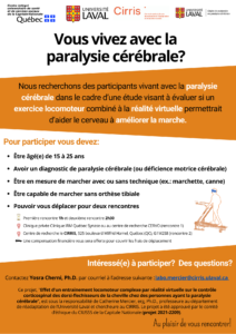 Le présent projet est un des premiers à s’intéresser aux effets d’un exercice locomoteur complexe (de précision) sur l’amélioration de la marche des personnes vivant avec une paralysie cérébrale.